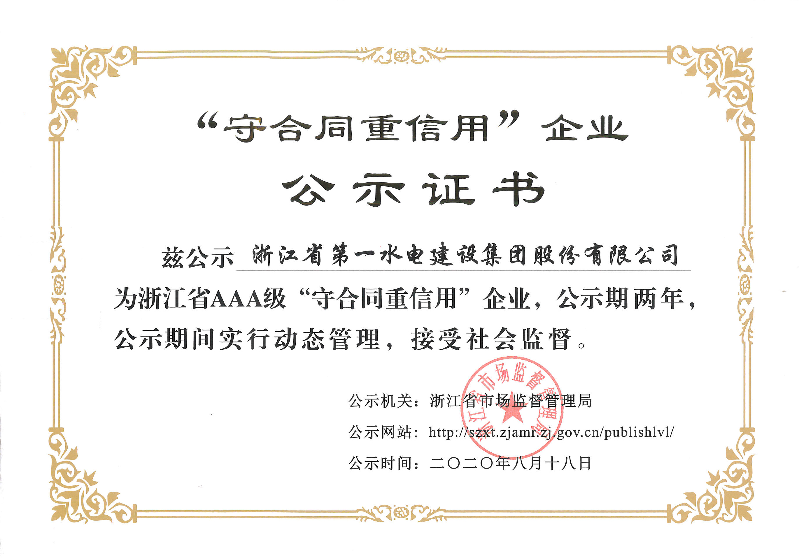 浙江省AAA級(jí)“守合同重信用”(2020年8月)
