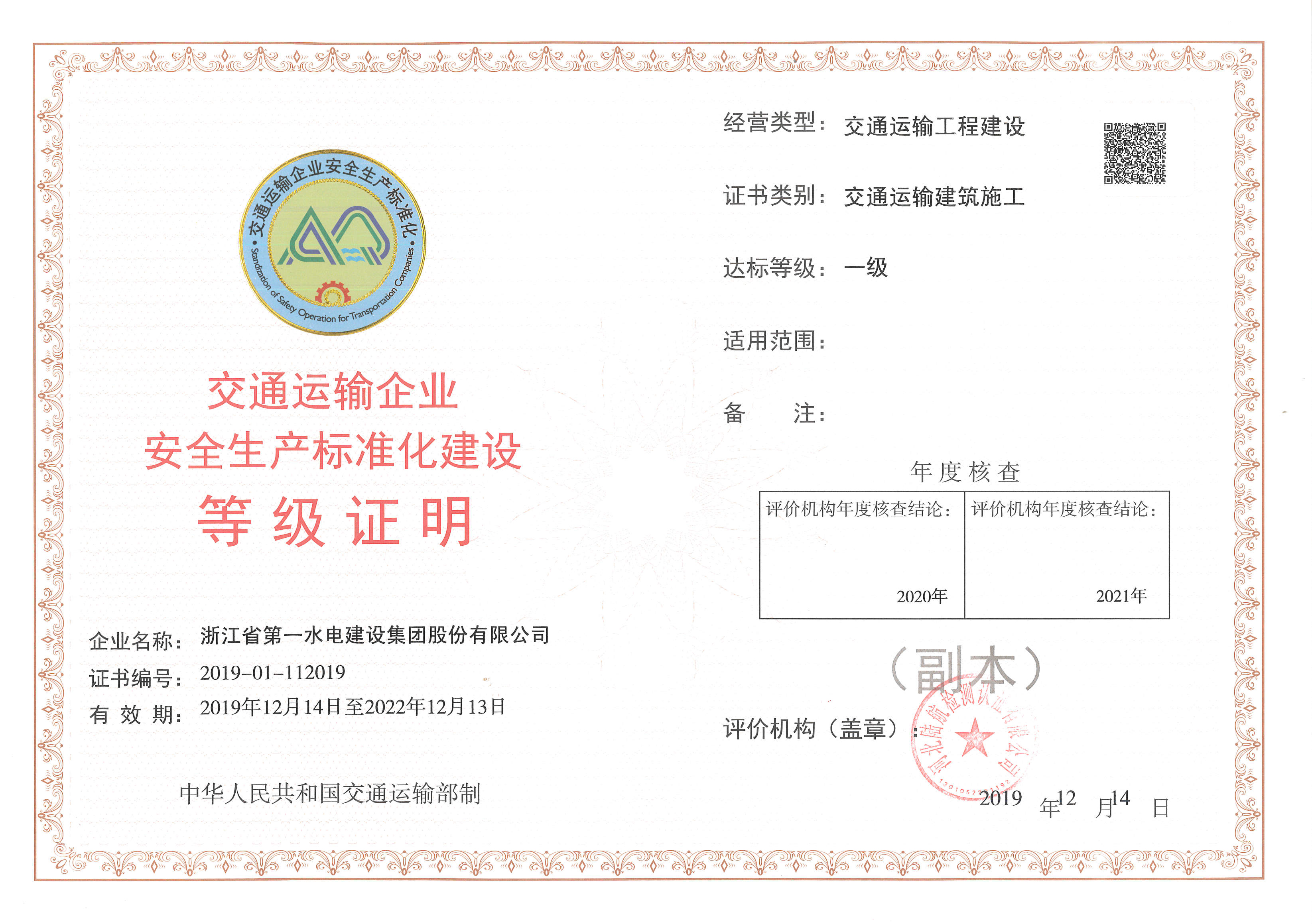 Class I Enterprise of Standard Construction of Safe Production of Transportation Enterprise