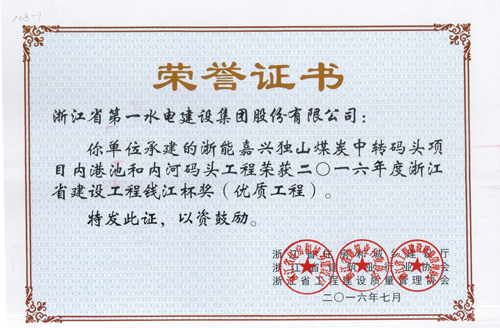 2016年度浙江省建設(shè)工程錢江杯獎(jiǎng)——浙能嘉興獨(dú)山煤炭中轉(zhuǎn)碼頭項(xiàng)目?jī)?nèi)港池和內(nèi)河碼頭工程