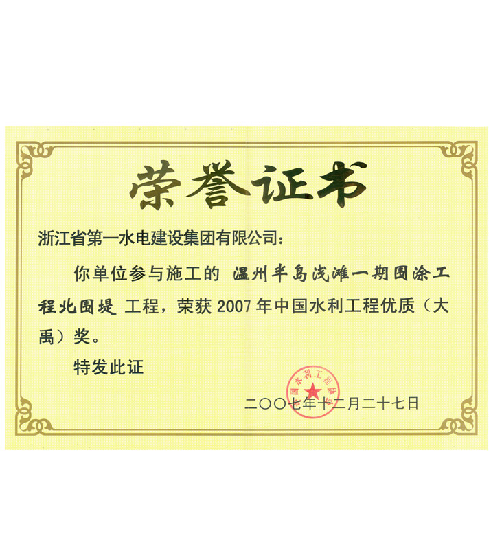 中國水利工程優(yōu)質(zhì)(大禹)獎——溫州半島淺灘一期圍涂工程北圍堤工程(2007)