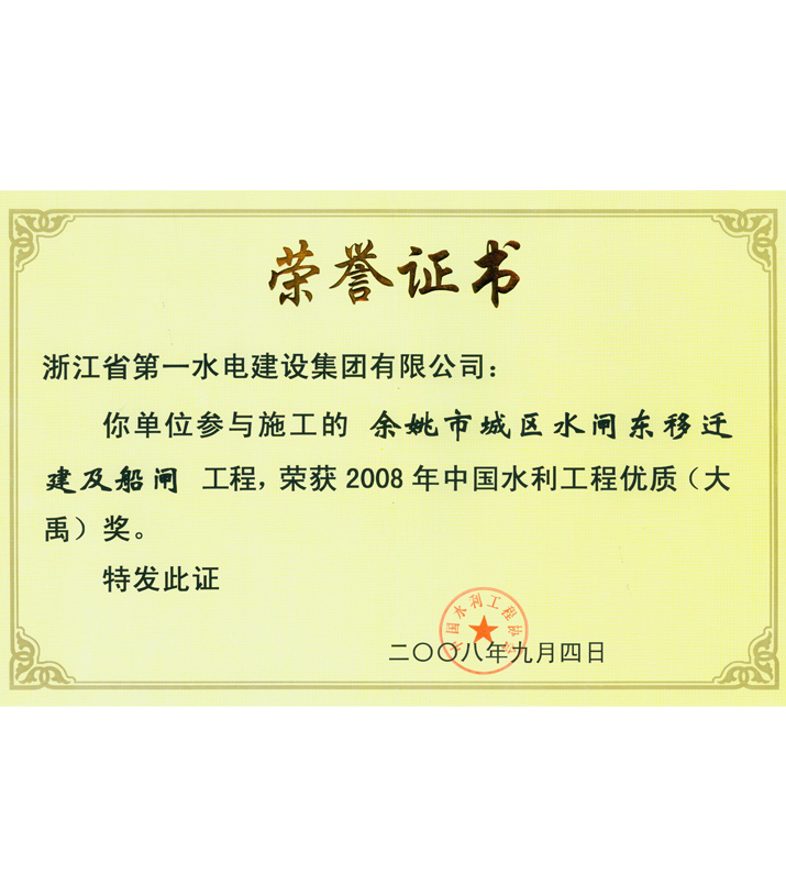 中國水利工程優(yōu)質(zhì)(大禹)獎——余姚市城區(qū)水閘東移遷建及船閘工程(2008)