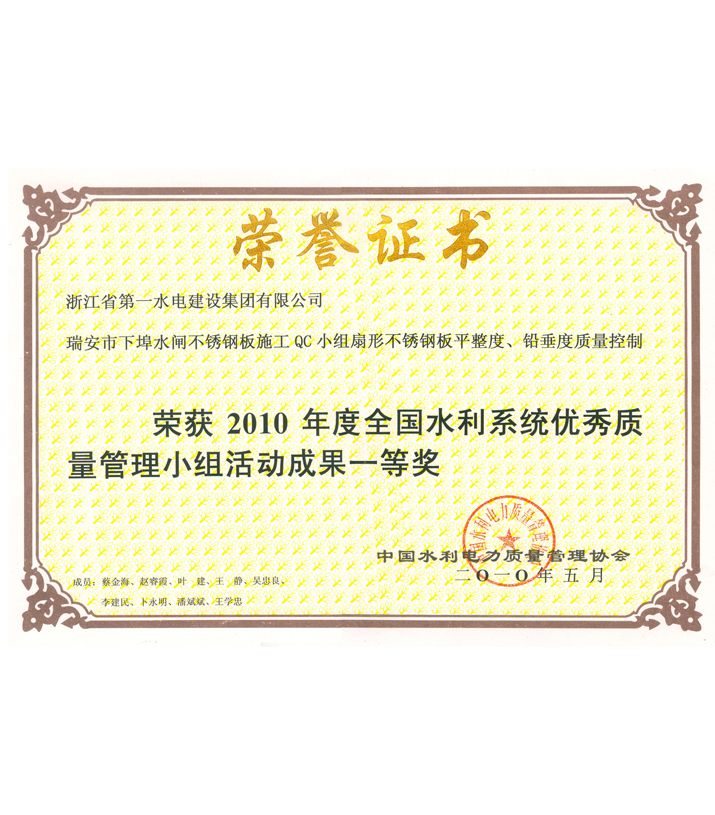 全國水利系統(tǒng)優(yōu)秀質(zhì)量管理小組活動成果一等獎——瑞安市下埠水閘不銹鋼板施工QC小組扇形不銹鋼板平整度、鉛垂度質(zhì)量控制(2010)