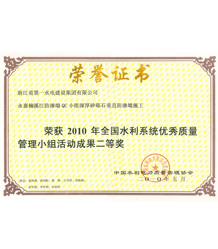 全國水利系統(tǒng)優(yōu)秀質(zhì)量管理小組活動成果二等獎——永嘉楠溪江防滲墻QC小組深厚砂礫石垂直防滲墻施工(2010)