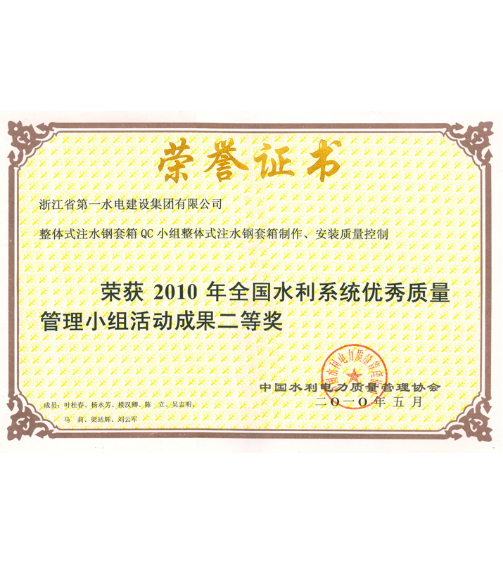 全國水利系統(tǒng)優(yōu)秀質(zhì)量管理小組活動成果二等獎——整體式注水鋼套箱QC小組整體式注水鋼套箱制作、安裝質(zhì)量控制(2010)