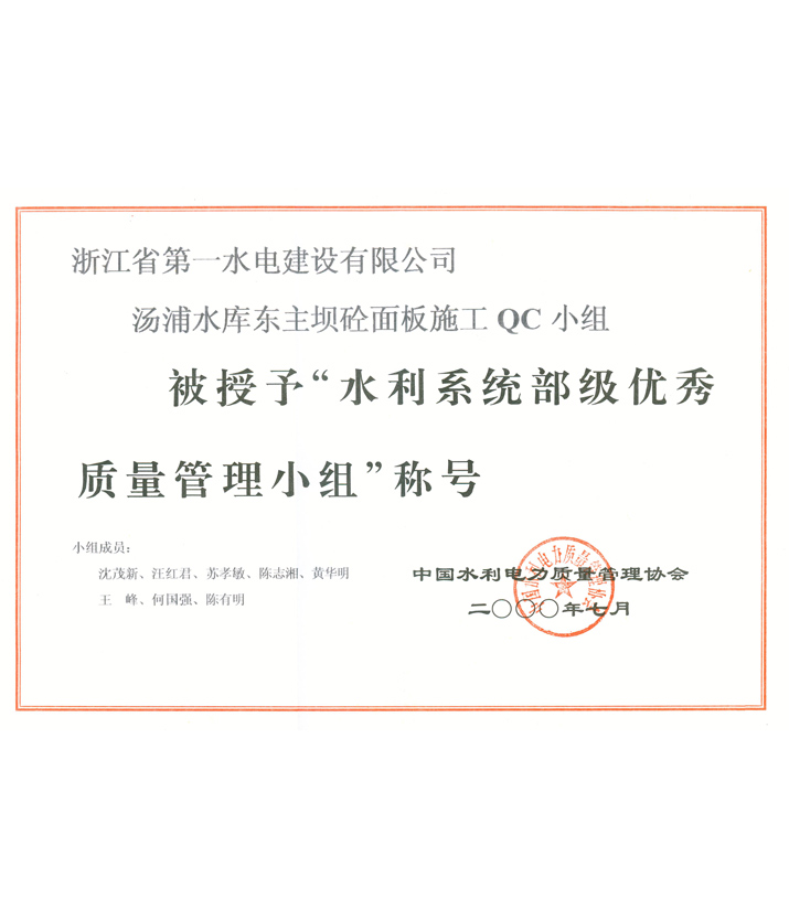 水利系統(tǒng)部級優(yōu)秀質(zhì)量管理小組——湯浦水庫東主壩砼面板施工QC小組(2000)