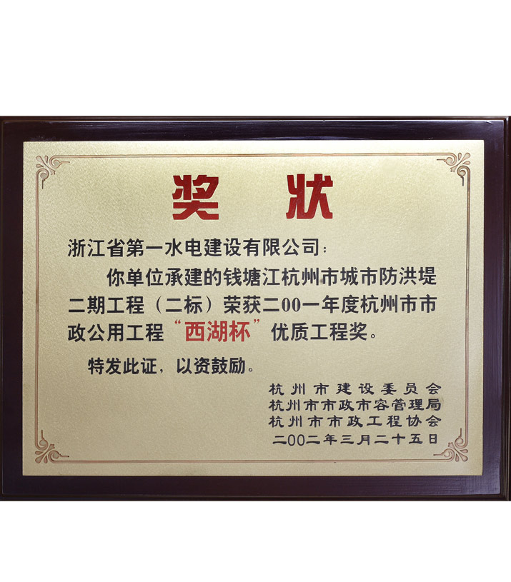 杭州市 “西湖杯”優(yōu)質(zhì)工程獎(jiǎng) ——錢塘江杭州市城市防洪堤二期工程二標(biāo)段(2001)
