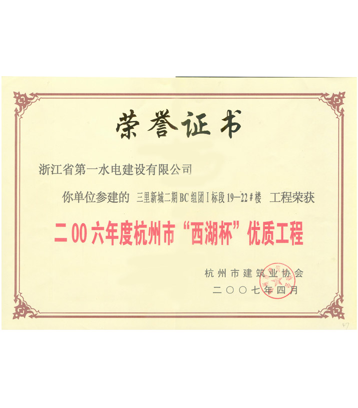 杭州市 “西湖杯”優(yōu)質(zhì)工程獎(jiǎng) ——三里新城二期BC組團(tuán)I標(biāo)段19-22#樓工程(2006)