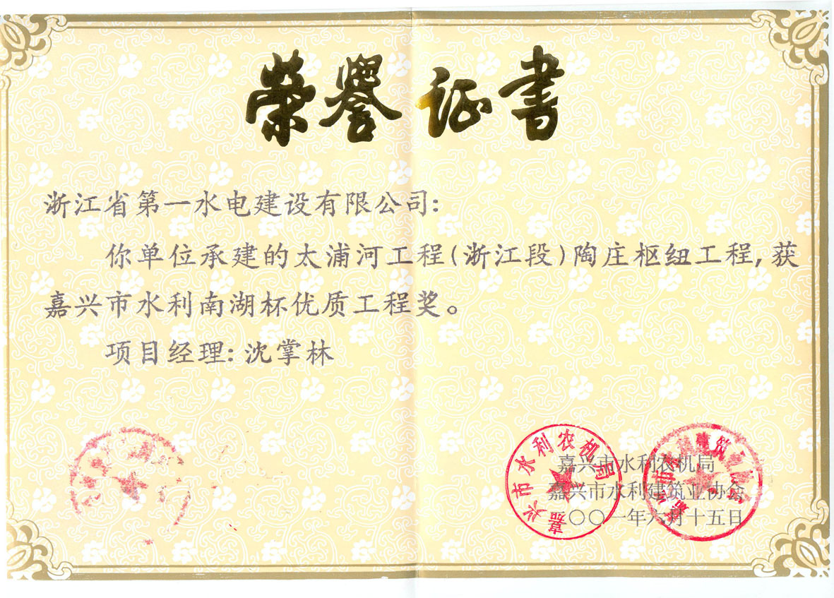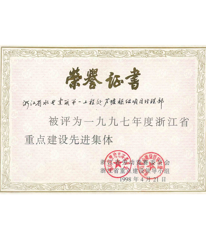 浙江省重點(diǎn)建設(shè)先進(jìn)集體 ——蘆墟樞紐項(xiàng)目經(jīng)理部(1997)
