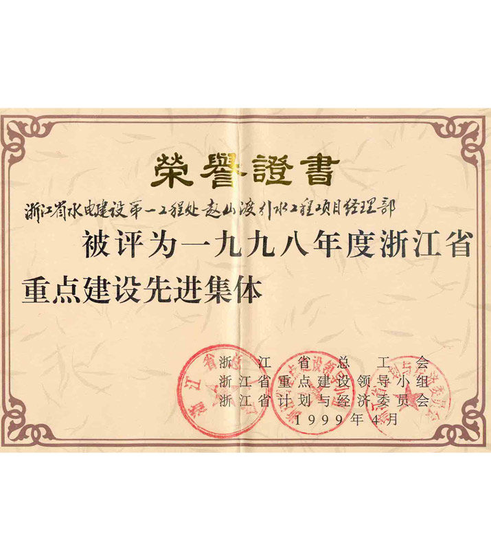 浙江省重點(diǎn)建設(shè)先進(jìn)集體——趙山渡引水工程項(xiàng)目經(jīng)理部(1998)