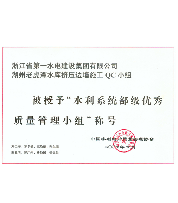 水利系統(tǒng)部級優(yōu)秀質(zhì)量管理小組——湖州老虎潭水庫擠壓邊墻施工QC小組(2007)