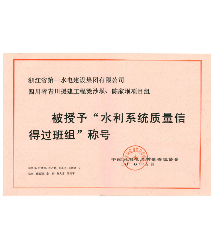 水利系統(tǒng)質(zhì)量信得過班組——四川省青川援建工程梁沙壩、陳家壩項目組(2010)