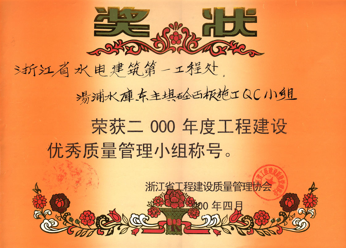 浙江省工程建設優(yōu)秀質(zhì)量管理小組——湯浦水庫東主壩砼面板施工QC小組(2000)