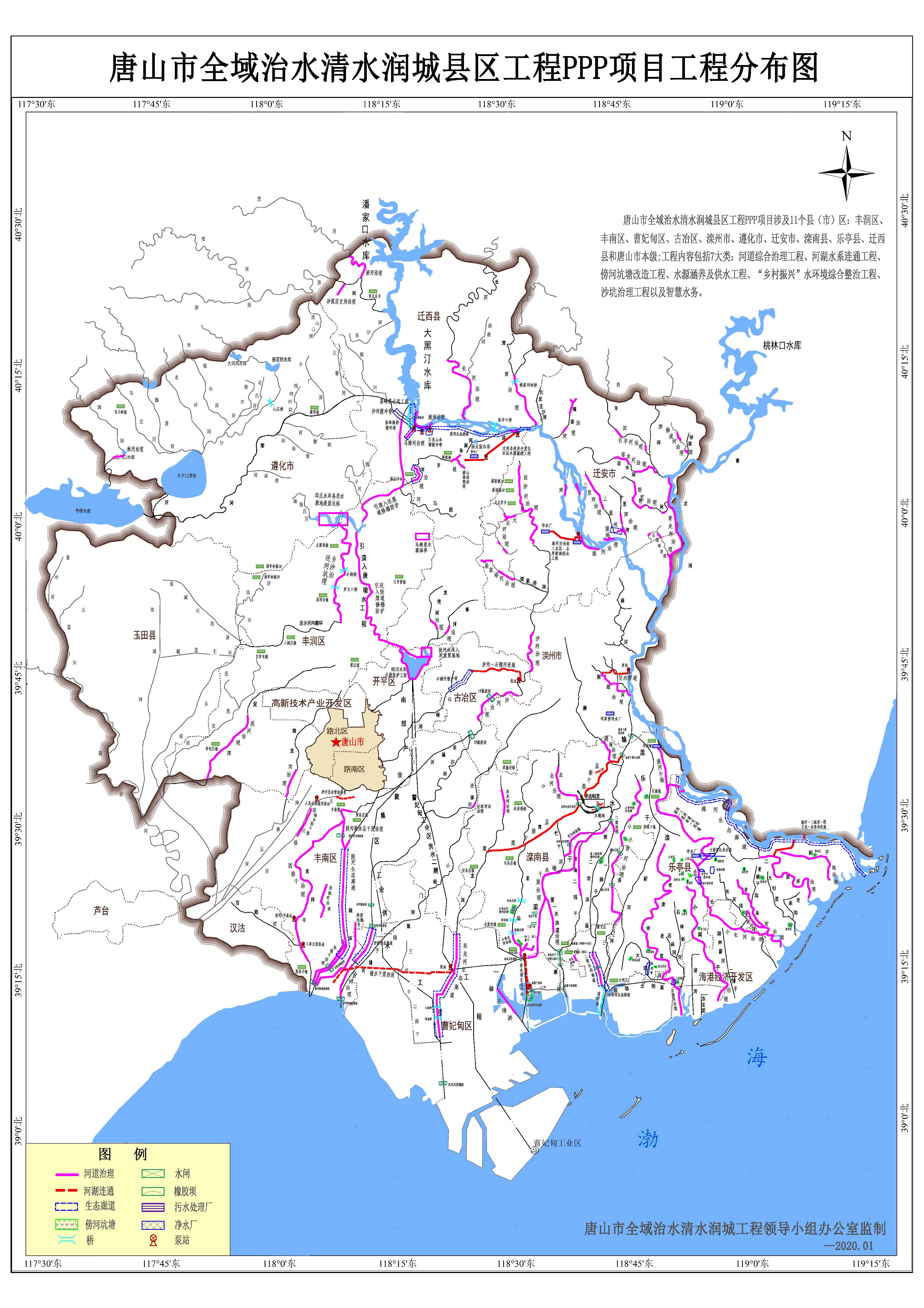 唐山市全域治水清水潤城工程是全國首個“市帶縣PPP項目”,工程涉及灤河、冀東沿海和薊運河三大水系,包括灤河、薊運河、沙河、還鄉(xiāng)河、陡河等5條主要河道。本工程項目為新建項目,包含河道綜合治理工程、河湖水系連通工程、傍河坑塘改造工程、水源涵養(yǎng)及供水工程、“鄉(xiāng)村振興”水環(huán)境綜合整治工程、沙坑治理工程以及智慧水務(wù)建設(shè)等共7大類、91個工程項目。