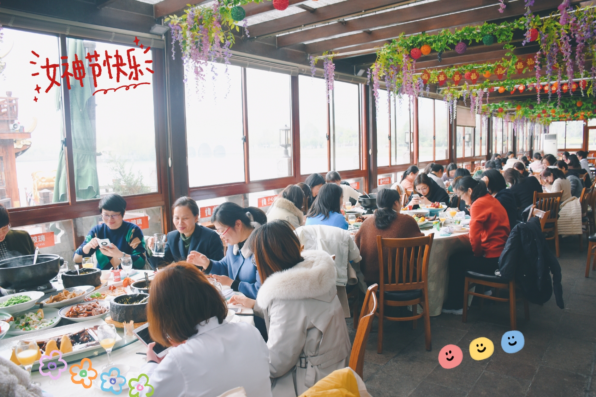 一群麗人,笑逐顏開。