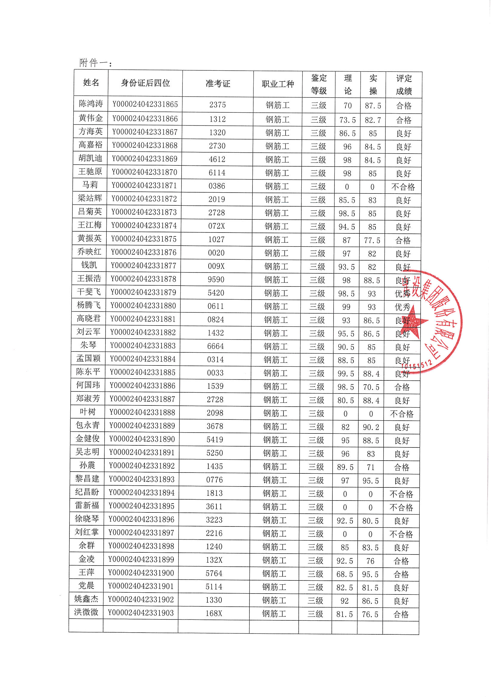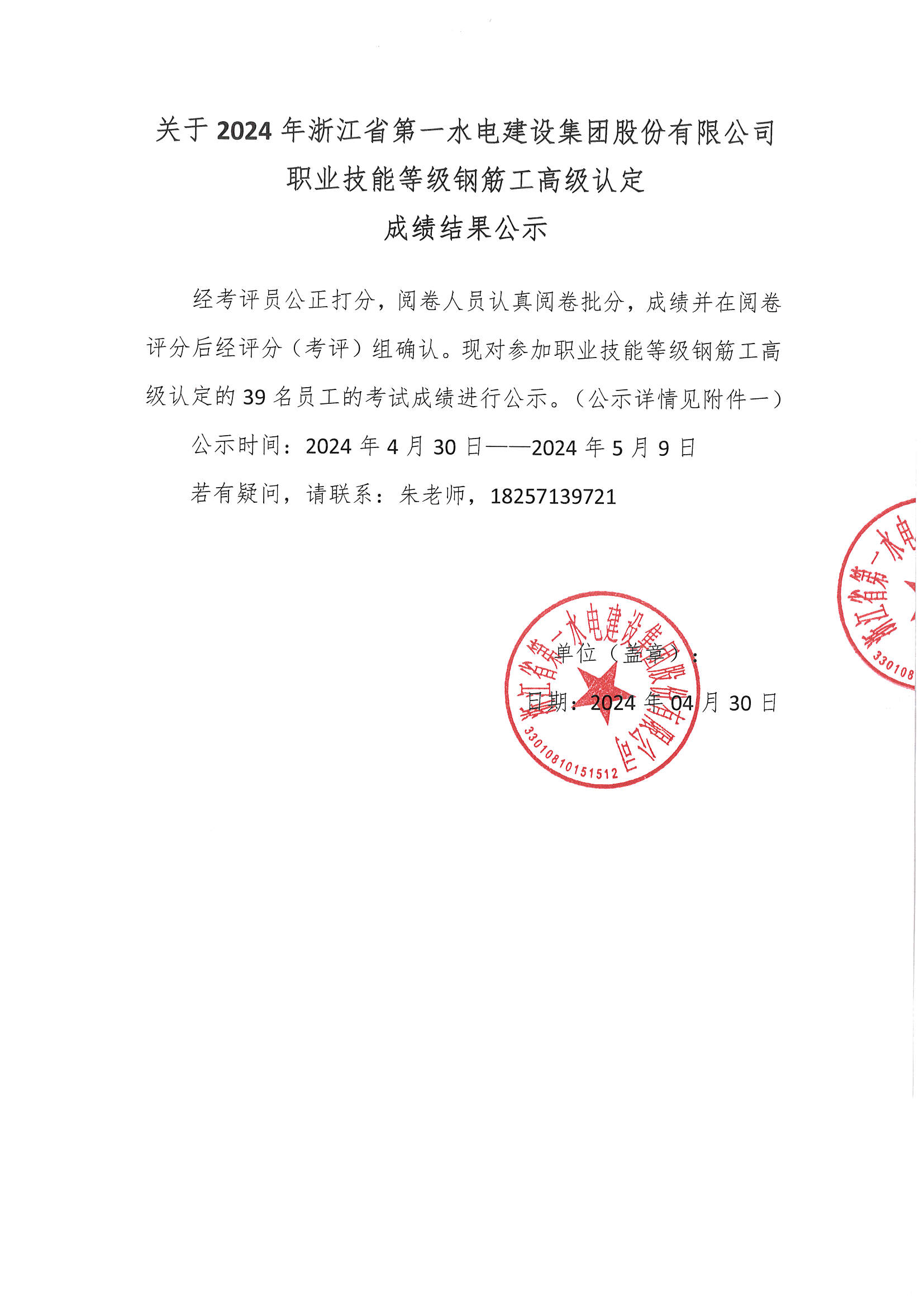 關(guān)于 2024 年浙江省第一水電建設(shè)集團(tuán)股份有限公司職業(yè)技能等級(jí)鋼筋工高級(jí)認(rèn)定成績(jī)結(jié)果公示