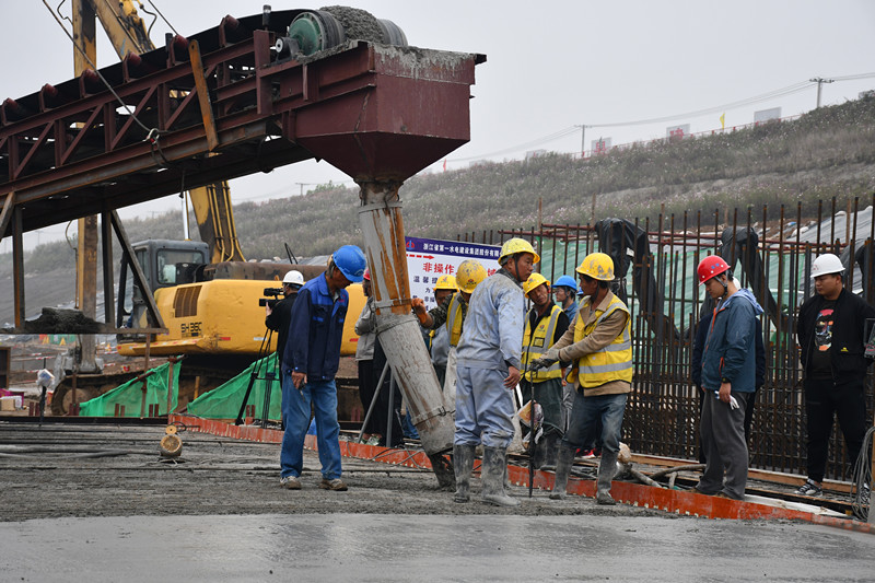 “準備了這么久,第一倉底板的澆筑終于要在我們計劃的時間開始了!”一位頭戴安全帽,衣服上沾滿著泥土的現(xiàn)場工人激動地說道。中午12點半,混凝土罐車準時到達施工現(xiàn)場。在一系列澆筑前的檢測工作完成后,“轟隆隆”的機械聲響起。