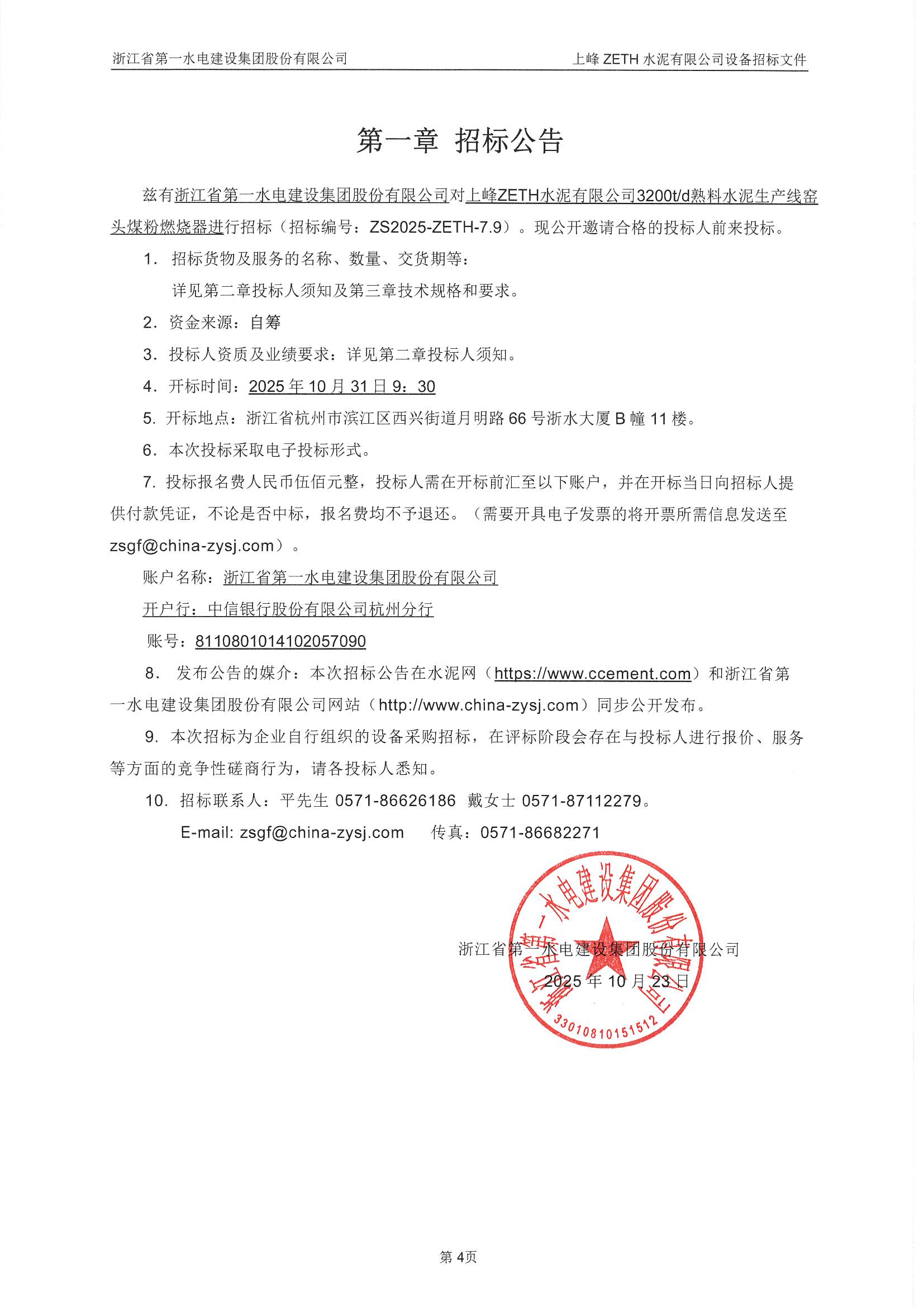 上峰ZETH水泥有限公司3200t/d熟料水泥生產(chǎn)線窯頭煤粉燃燒器招標(biāo)公告