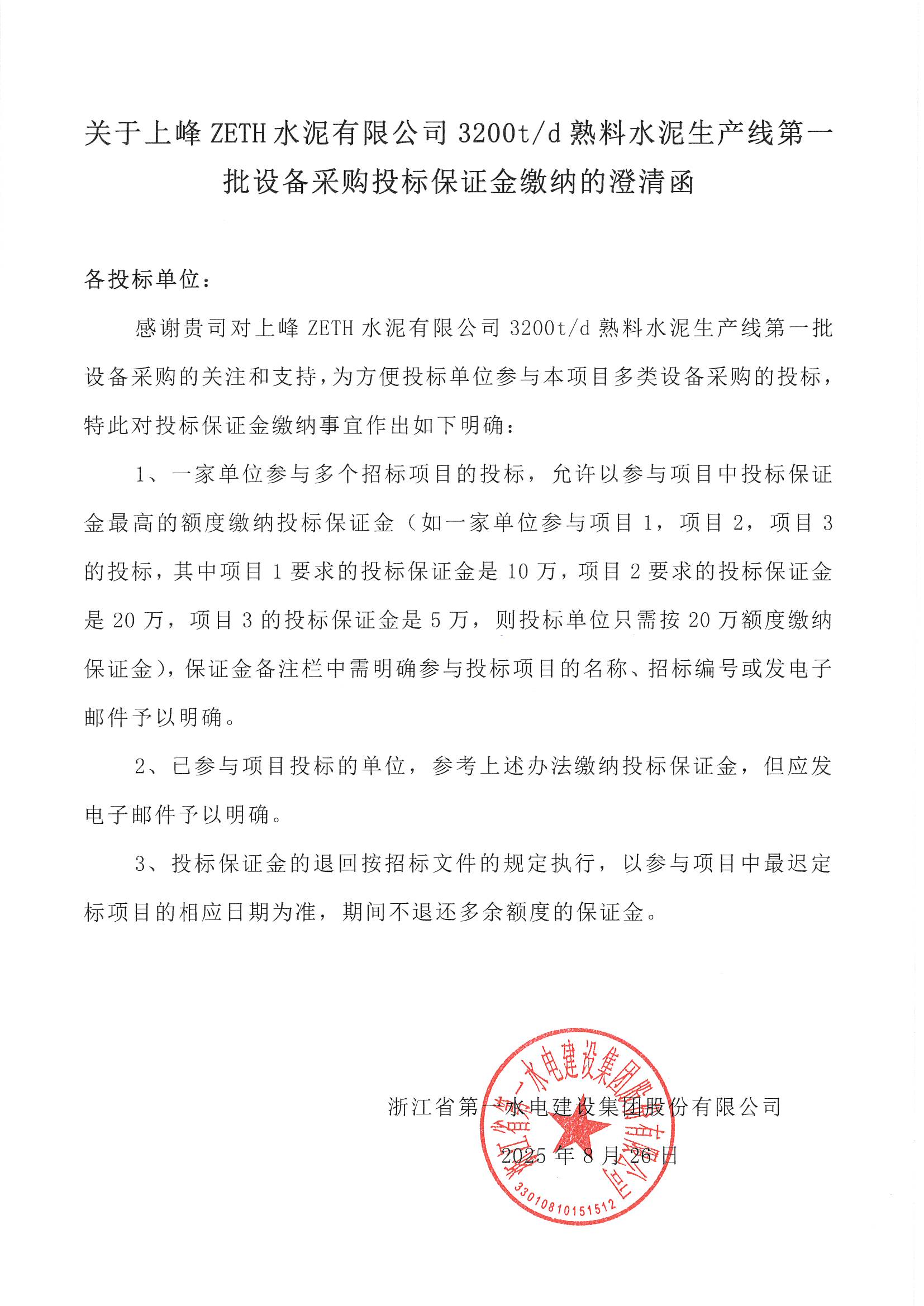 關(guān)于上峰ZETH水泥有限公司3200t/d熟料水泥生產(chǎn)線設(shè)備采購?fù)稑?biāo)保證金繳納的澄清函